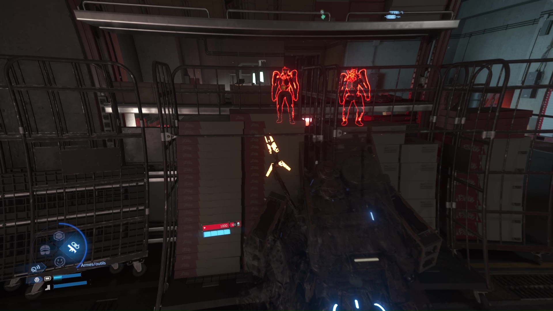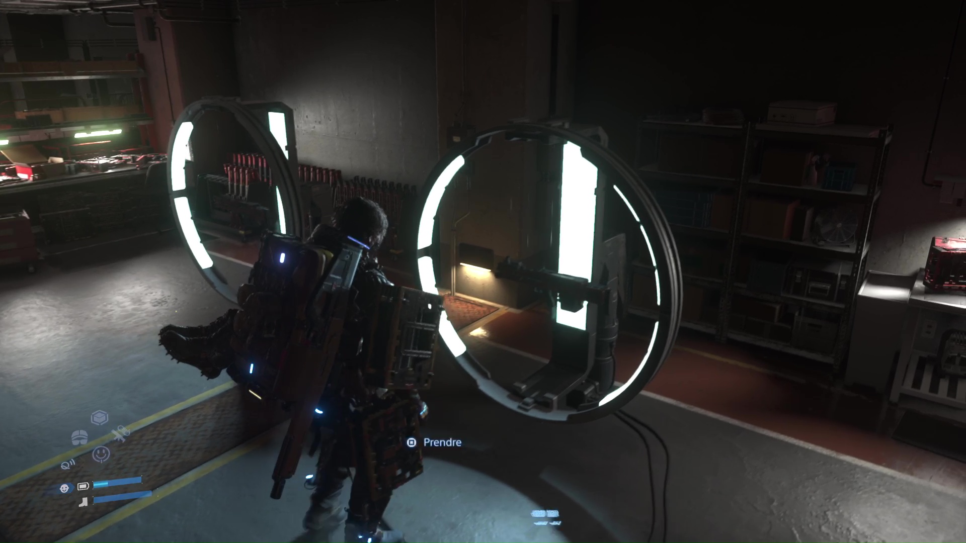 À partir de là, la porte du bunker va s’ouvrir. Descendez les escaliers et observez les deux armes exposées dans la petite salle. Prenez-les puis rejoignez la porte au fond de cette pièce pour déclencher l’apparition de deux méchas fantômes.