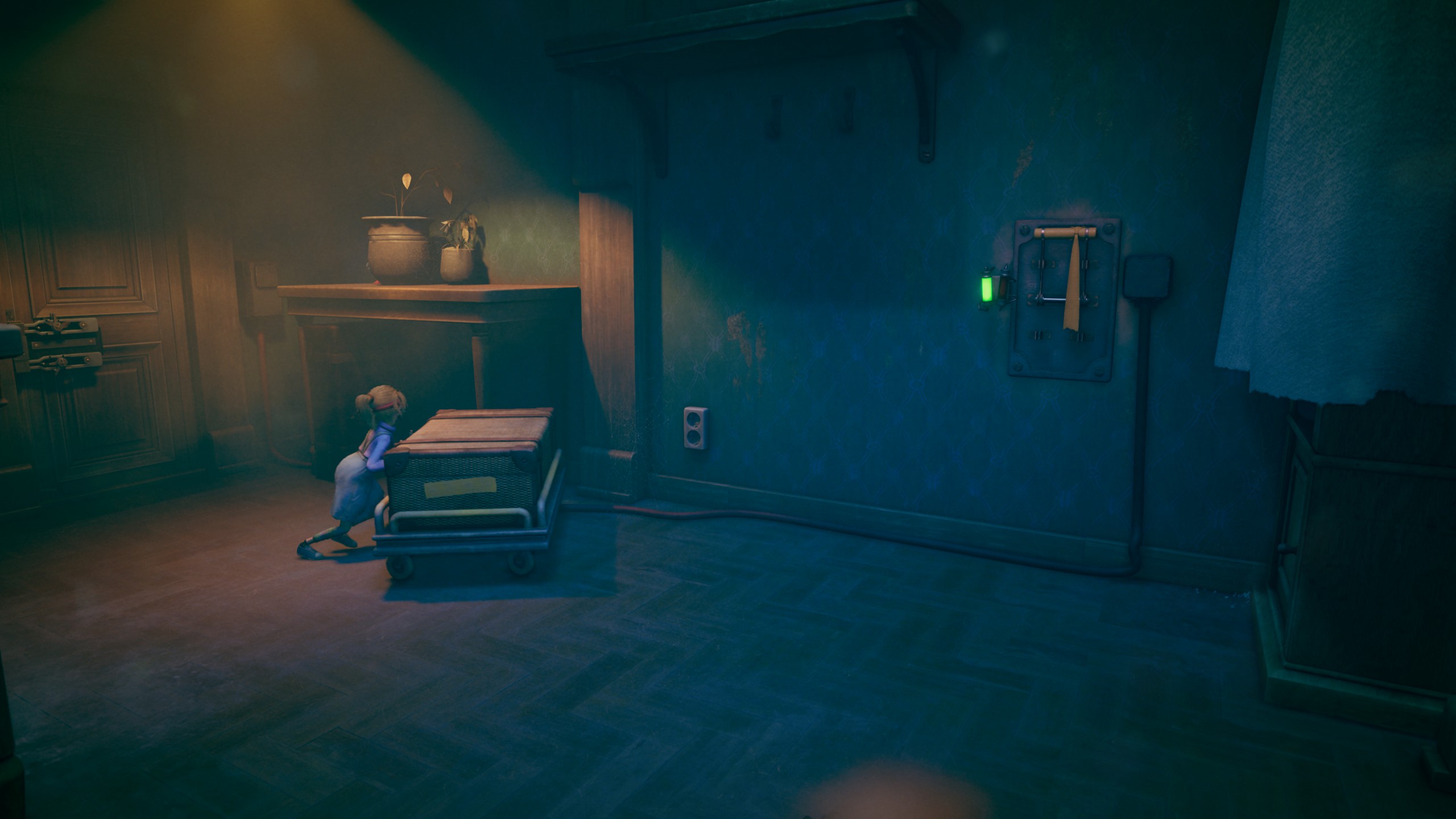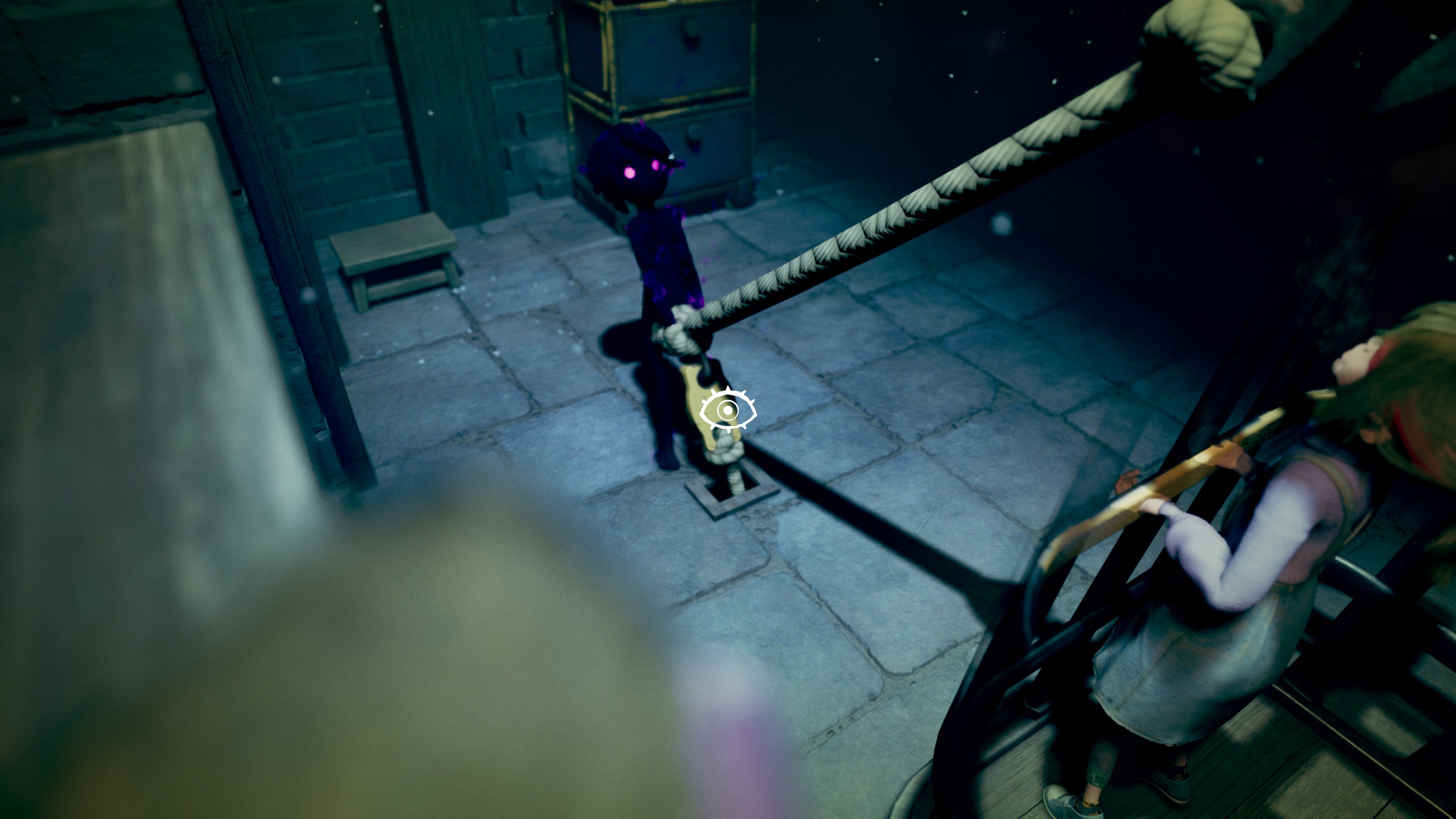 Au premier abord, la narration d’Out of Sight est bougrement charmeuse. Vous prenez le contrôle de Sophie, une petite fille aveugle ayant le pouvoir de voir à travers les yeux de son nounours, Teddy. Emprisonné dans un manoir dangereux où rôde maitresse Janna et son acolyte Clayton, notre héroïne aura pour objectif de s’enfuir. Pour ce faire, notre enfant va devoir aller au sommet de la bâtisse, et y trouver une fenêtre permettant de prendre la poudre d’escampette.